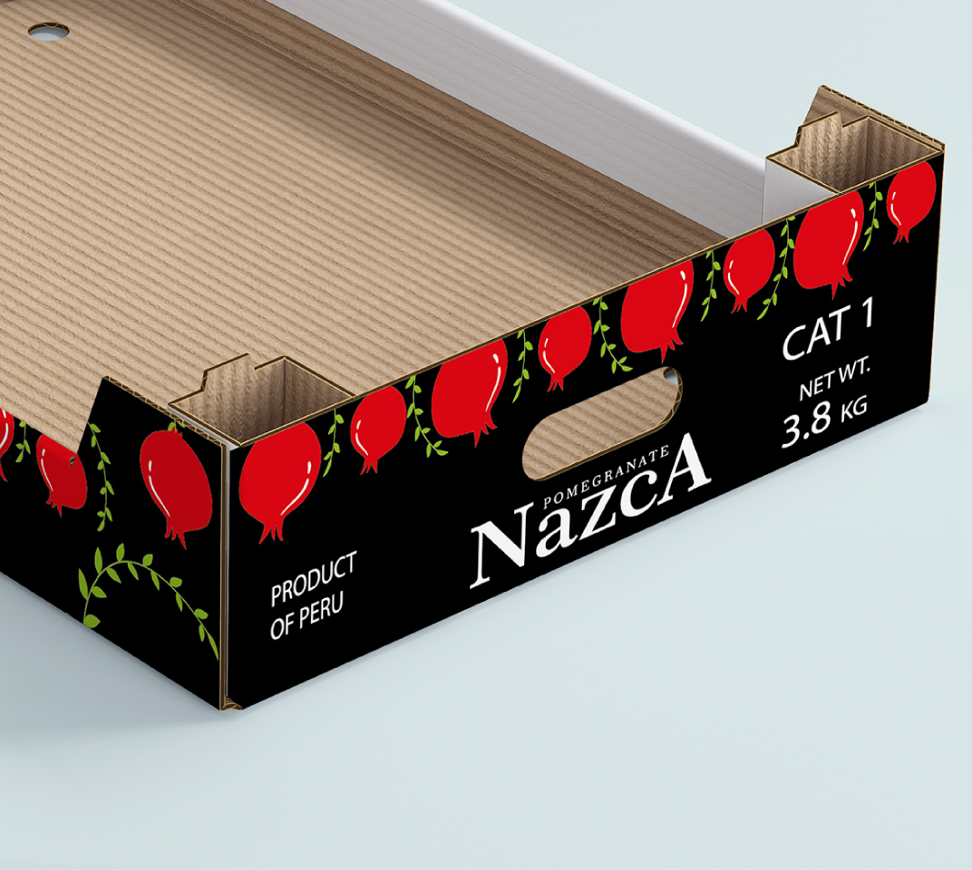 AEI Global, con presencia en Europa, es una compañía agroexportadora de paltas y granadas peruanas. La empresa nos encomendó el diseño de la bandeja para el transporte de sus granadas Wonderfull. La caja se imprimió a tres colores sobre craft; para ello usamos el negro de fondo para destacar la marca Nazca, y para las granadas usamos un GCMI (color) rojo. Ubicamos en la parte superior de la bandeja, granadas en racimos reforzando la idea con ramas verdes estilizadas.