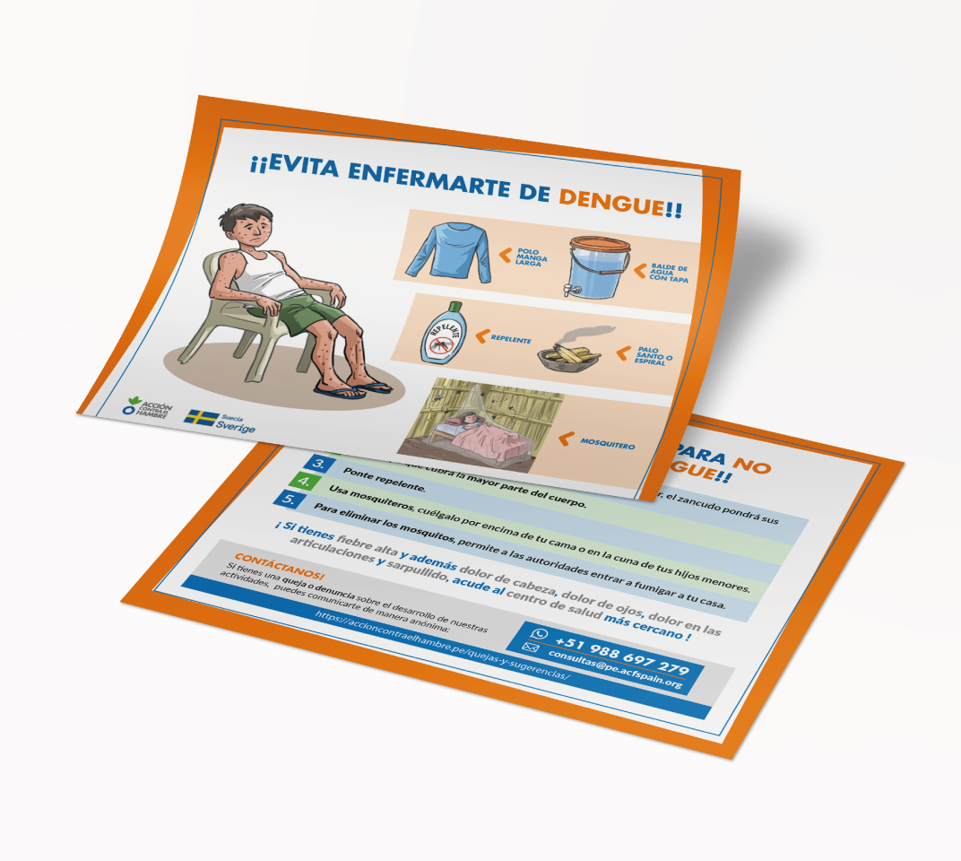 En el marco de la Campaña contra el Dengue en la ciudad de Piura y con el apoyo de instituciones como UNICEF, el Gobierno de España y la Región de Piura, ACH logró llevar material publicitario de concientización a la población piurana. Se diseño y diagramó calendarios, banners, abanicos y volantes siguiendo la línea gráfica de ACH y el uso de ilustraciones para ser mas didácticos y cercanos a la población