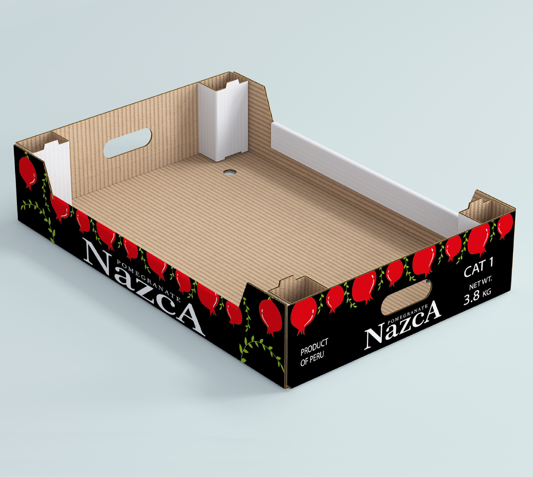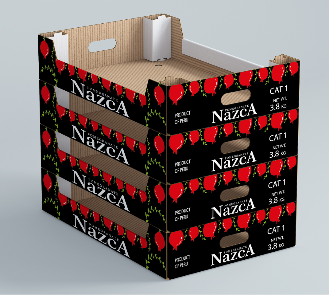 AEI Global, con presencia en Europa, es una compañía agroexportadora de paltas y granadas peruanas. La empresa nos encomendó el diseño de la bandeja para el transporte de sus granadas Wonderfull. La caja se imprimió a tres colores sobre craft; para ello usamos el negro de fondo para destacar la marca Nazca, y para las granadas usamos un GCMI (color) rojo. Ubicamos en la parte superior de la bandeja, granadas en racimos reforzando la idea con ramas verdes estilizadas.