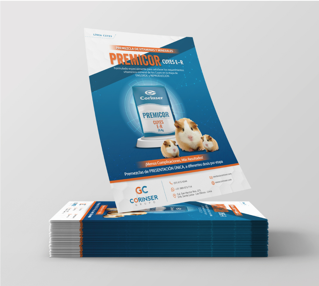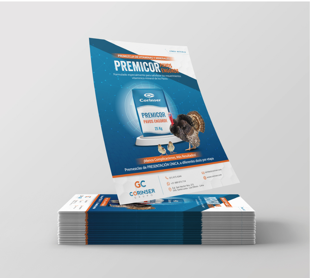 - Encartes promocionales para la Línea PREMICOR, dirigida a aves y animales menores como cuyes.